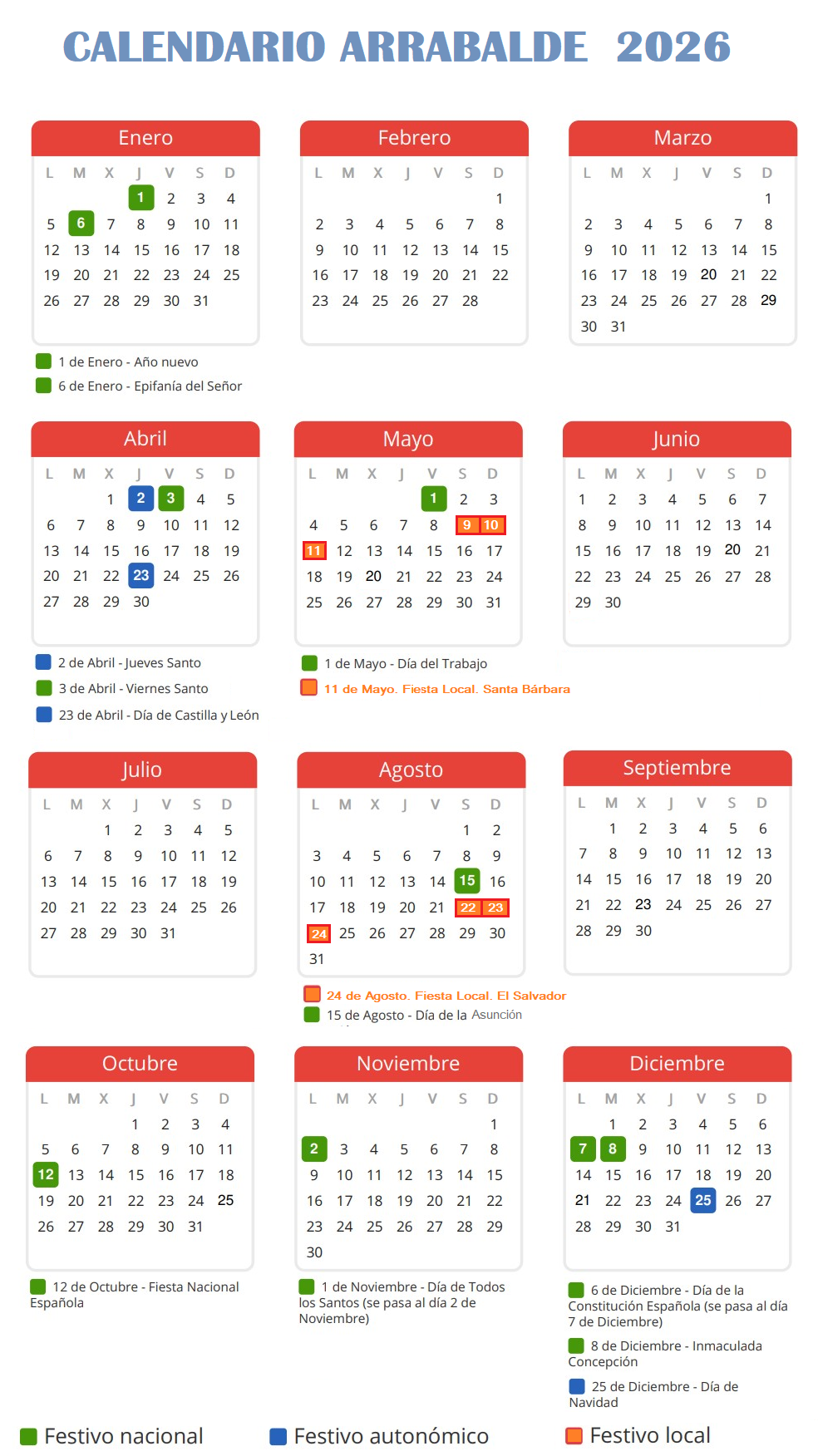 Arrabalde y el de Madrid para el año 2026 con todos los festivos.
