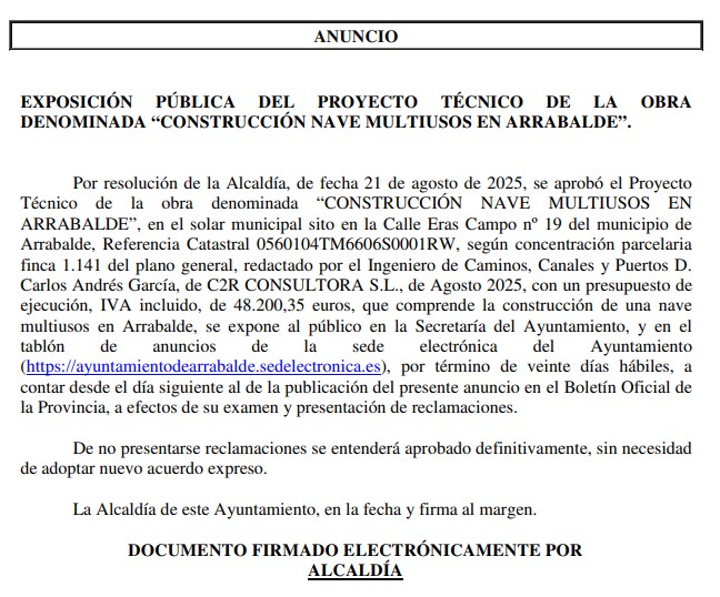 Ayuntamiento de Arrabalde publica a través de su sede electrónica el