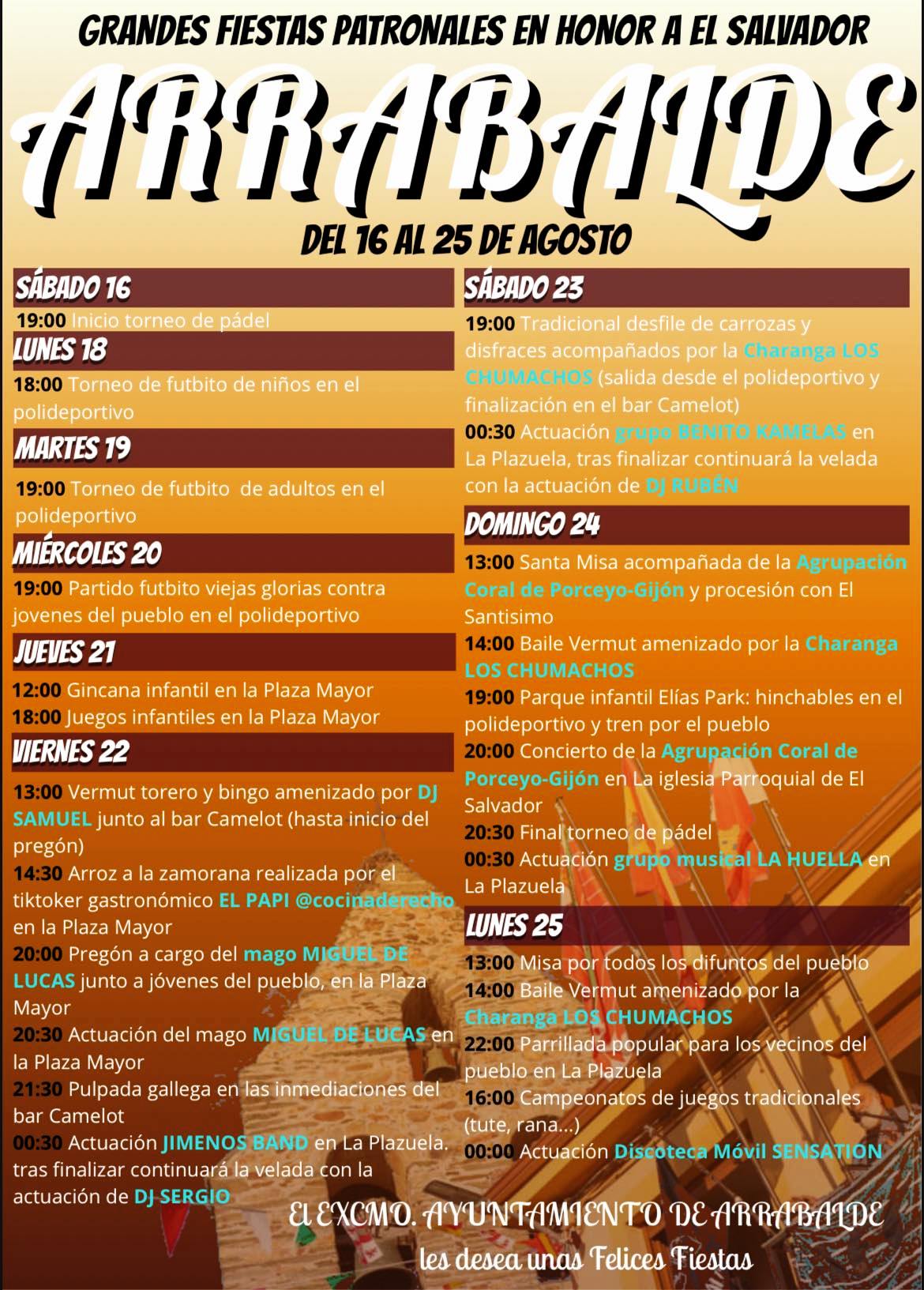 Actualidad Noviembre Panorámicas. Hoy a través del satélite Airbus panorámicas actualizadas de la Sierra y del Pueblo.... - Regulación de limpieza de solares al objeto de prevenir incendios. El Aytmto. de Arrabalde publica a través de su sede electrónica el anuncio de consulta publica relativo a la regulación sobre limpieza de solares y huertos y la necesidad de aprobar una normativa que pueda contribuir a la prevención de incendios. Algo que llega tarde pero bienvenida sea la iniciativa, que demanda el conjunto de los vecinos... ver...-- Cobranza de basuras 2º semestre. El Aymto de Arrabalde publica en su portal electrónico el nuevo cobro de basuras.. - Calendario mensual "Noviembre".. . - Fiestas locales. El Boletin Oficial de la la Provincia de Zamora, publica las Fiestas Locales de todos los municipios para el año 2026. Las asignadas para Arrabalde son: El 11 de Mayo para "Santa Bárbara" y el 24 de Agosto para "El Salvador"....ver... - Calendario laboral y Festivo 2026. Ya está disponible el calendario laboral de Arrabalde y el de Madrid para el año 2026 con todos los festivos... ver....ver eventos y noticias mes de Octubre...