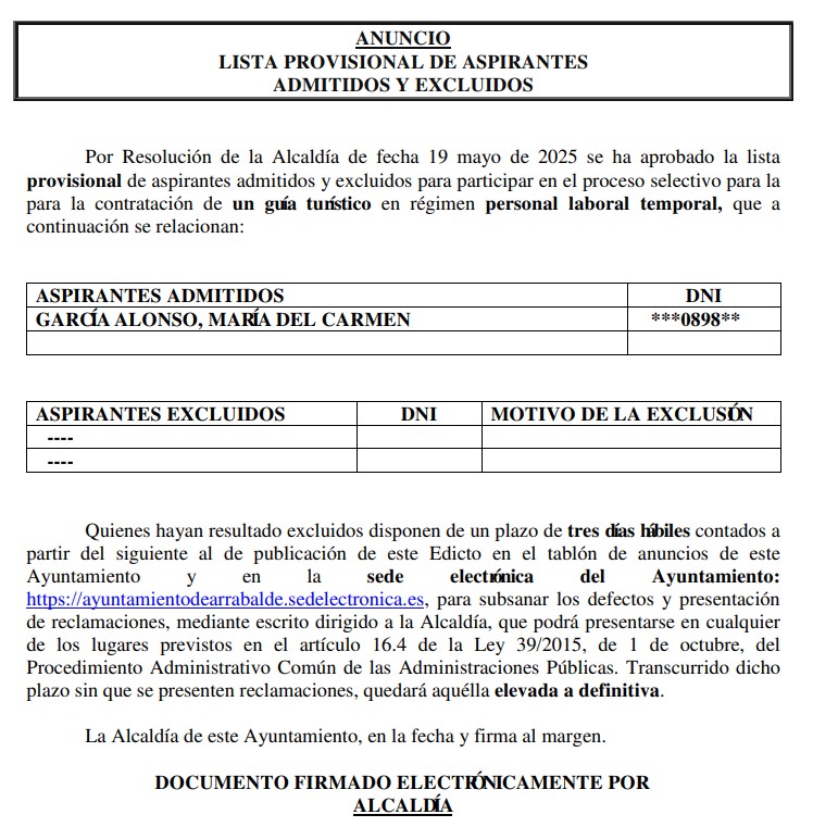 Lista de aspirantes admitidos - Guía turístico - El Ayuntamiento de Arrabalde publica a través de su sede electrónica el anuncio sobre la lista provisional de aspirantes admitidos y excluidos para la contratación de un guía turístico y que recaído en Dña. Maria del Carmen García Alonso.