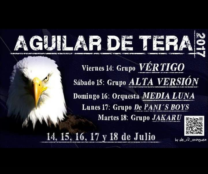 Los que disfrutáis las vacaciones en el publo tenéis ocasión de disfrutar de buena música en un ambiente festivo. Este fin de semana son las fiestas de Aguilar de Tera, una de las mejores del verano. Os dejo la referencia de los grupos que actuaran en la misma.