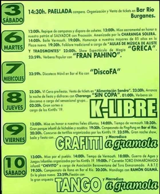 Incluyo los programas de las fiestas que se celebran en nuestros pueblos mas o menos cercanos durante los meses de Julio y Agosto . Solo tienes que ir al fin de semana que te interese