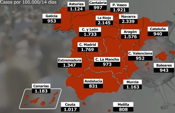 España en riesgo muy alto, pero no habrá confinamiento en Navidad y de momento sin restricciones. España en riesgo muy alto, pero no habrá restricciones en Navidad. Las Comunidades Autónomas se resisten a poner restricciones de cara a la Navidad, mientras el Gobierno holandés decreta un mes de confinamiento estricto. Según diversos medios de opinión ya llegamos tarde para frenar la subida de contagios, y lo fiamos todo al milagro y efecto de las vacunas (tenemos un 80% de personas vacunadas, aunque la presión hospitalaria aumenta cada día) y, a las medidas de prevención en lo que se refiere a "mascarillas, distancia, ventilación" evitando las reuniones familiares en grupos muy numerosos, pero no habrá confinamiento, como mucho el cierre de restaurantes y ocio nocturno. 20 nuevos brotes han surgido en los últimos 2 días. .- La incidencia media en España esta hoy en 511 casos. La tasa de incidencia en Castilla León se sitúa en riesgo muy alto con 521 casos, 90 mas que la semana anterior Zamora tiene una incidencia de 440 casos, Burgos (500), Ávila (527), Palencia (555,7), León (466,44), Soria (452,2) y Salamanca (386,6) están en nivel de riesgo alto, mientras que aguanta en medio Segovia (266,4). Así estaban anoche la plaza de San Francisco en Sevilla y La Puerta de Sol en Madrid