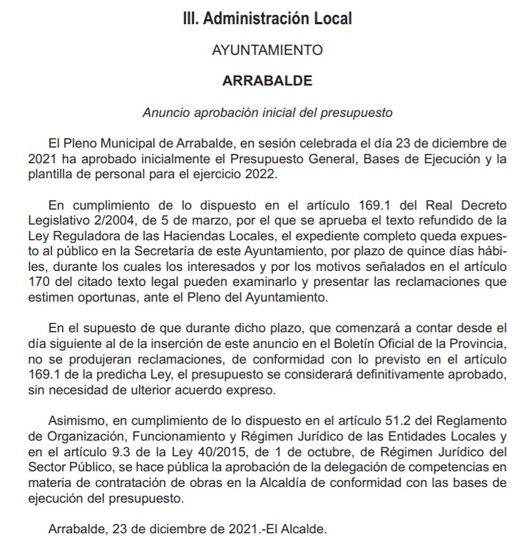 ************************************************************************ El Ayuntamiento de Arrabalde publica en su tablón de anuncios la aprobación por el pleno municipal del Presupuesto General, Bases de Ejecución y la Plantilla de Personal para el ejercicio 2022.