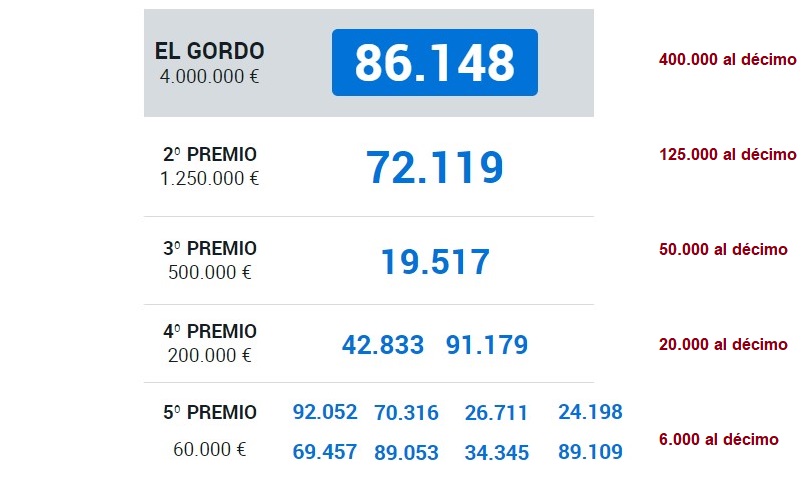 La pandemia sigue implacable su expansión, pero hoy es un día especial: Se celebra el sorteo de la Lotería de Navidad y por unas horas nos olvidamos de la que se nos viene encima. Finalizado el sorteo la lotería ha repartido premios por toda España. El 86148 ha sido el numero agraciado con el premio gordo. Aquellos a los que os haya tocado, que lo disfrutéis. Números premiados lotería de Navidad 2021