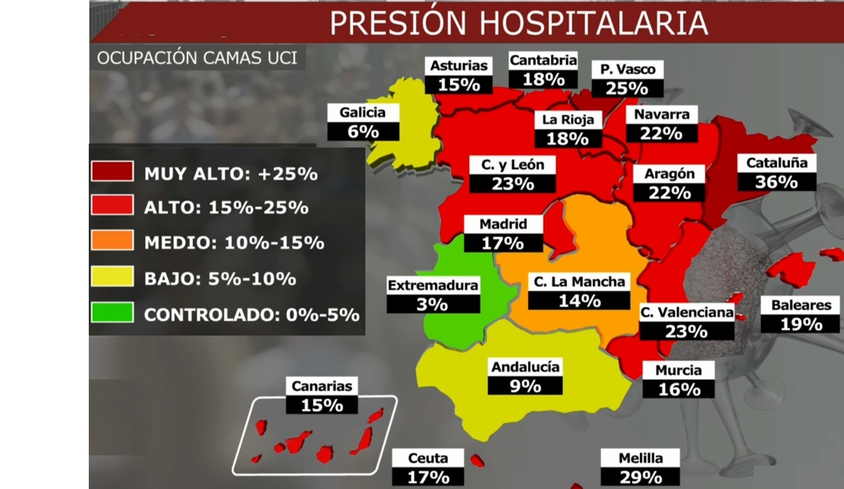 Explosión de contagios "en Navidad" La pandemia se desboca, y era de esperar, aunque por fortuna está siendo menos letal. Con una incidencia de 1206 casos, 214.000 nuevos contagios y 120 muertes desde el Viernes pasado, nos enfrentamos a un escenario difícil y complicado en las próximas semanas y no porque nos afecte gravemente la variante Omicrón (hay menos gente en UCI y mueren menos que en las pasadas olas, aunque esto no es un alivio, ni resta gravedad a la situación), sino porque la presión hospitalaria va aumentando de forma alarmante (500 ingresos diarios), y porque vamos saturando los centros de atención primaria, donde conseguir una cita, es misión imposible y porque están demorando las intervenciones de otro tipo de patologías y enfermedades. Se suma la mala noticia de que aún con la tercera dosis, muchas personas están enfermando por Covid. Es verdad que la pandemia ha causado demasiados muertes y que otros muchos tendrán que sobrellevar las secuelas del Covid persistente, pero es lo que nos ha tocado vivir y hay que seguir hacia adelante sin rendirnos. Tenemos que aceptar que este virus, no se irá de nuestras vidas y será como el de la gripe que de vez en cuando llega a oleadas a las vidas de muchas personas, pero que sobrellevaremos defendiéndonos del mismo, con las dosis de vacunas y la prevención personal. Como siempre, las comunidades se preparan para restringir el ocio nocturno y el cierre de bares, pero aunque se hiciera, ya llegamos tarde. Eso se tendría que haber hecho en todo caso antes de las fiestas navideñas. La mala noticia es que aún con las tres dosis no estamos totalmente inmunizados, podemos contagiarnos y tener los sintomas de catarro, molestias de garganta, mucosidad y algo de fiebre. En todo caso, cuídense y ánimo. INCIDENCIA ACUMULADA Y PRESIÓN EN LAS UCI POR COMUNIDADES AL DÍA DE HOY