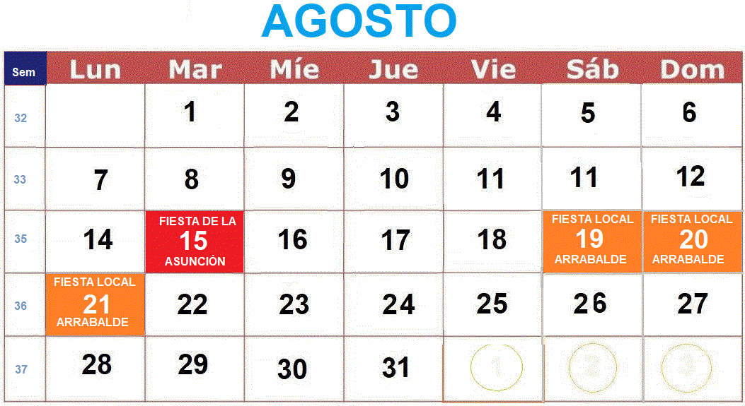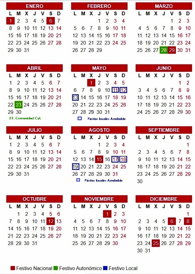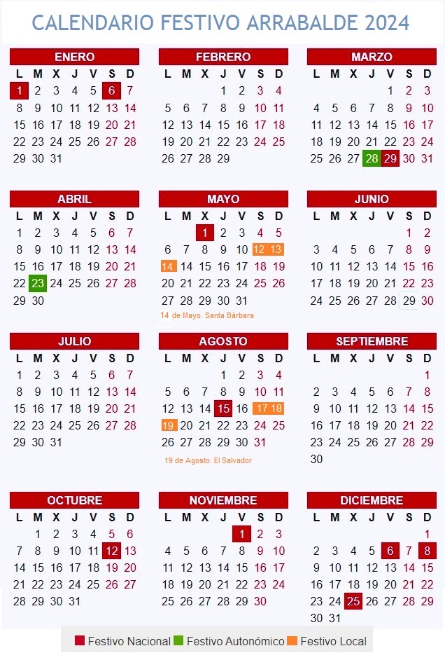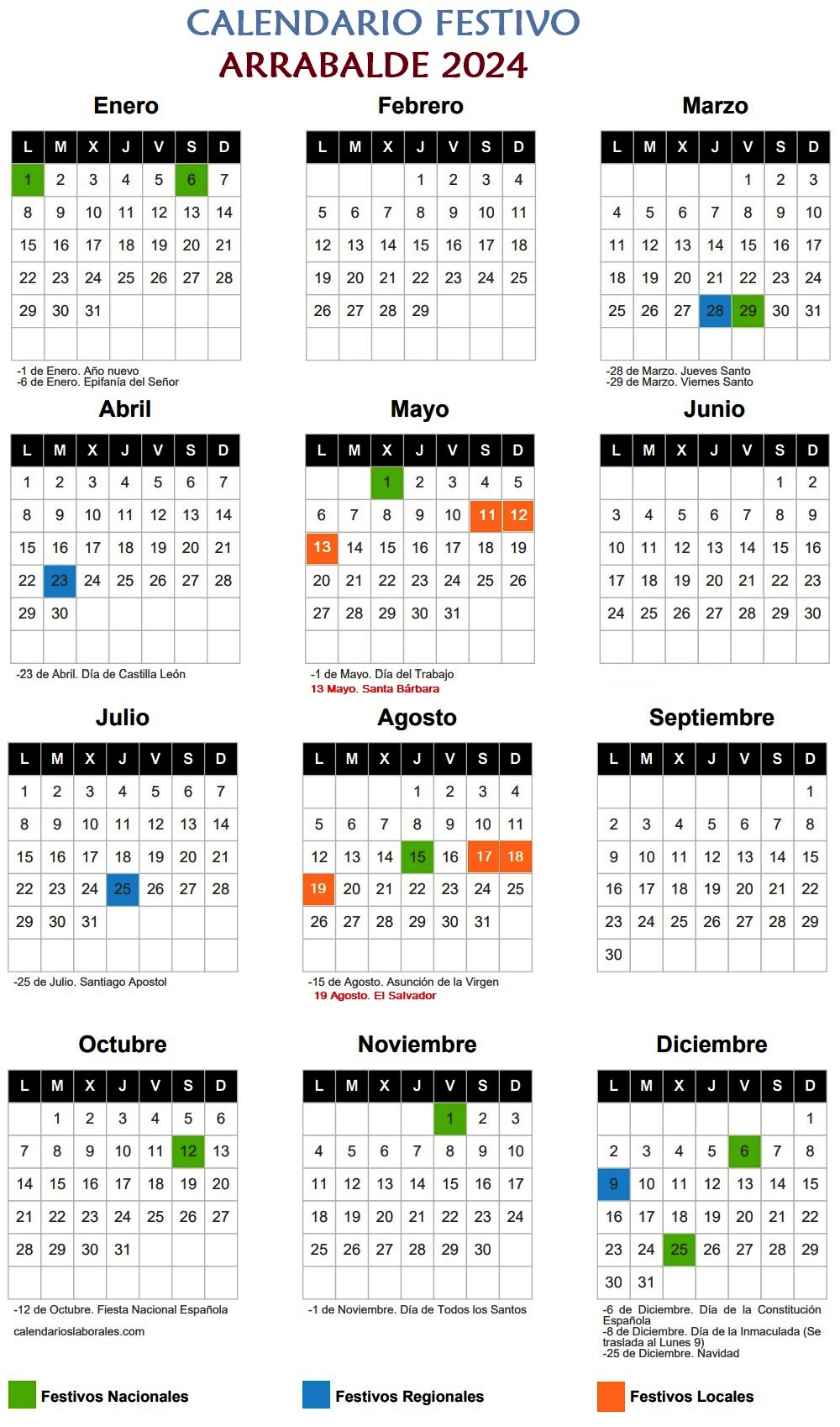 Faltan las dos fiestas de carácter local, que deberán acordarse para cada municipio por la autoridad laboral competente, hasta alcanzar 14 fiestas laborales. * En Arrabalde se supone que la Fiesta de Mayo "Santa Barbara" para el 2024 será el 13 de Mayo y la de "El Salvador" el 19 de Agosto, pero todavía quedan por confirmar en el B.O.Z. Cuando así se publiquen las insertaré en la página.