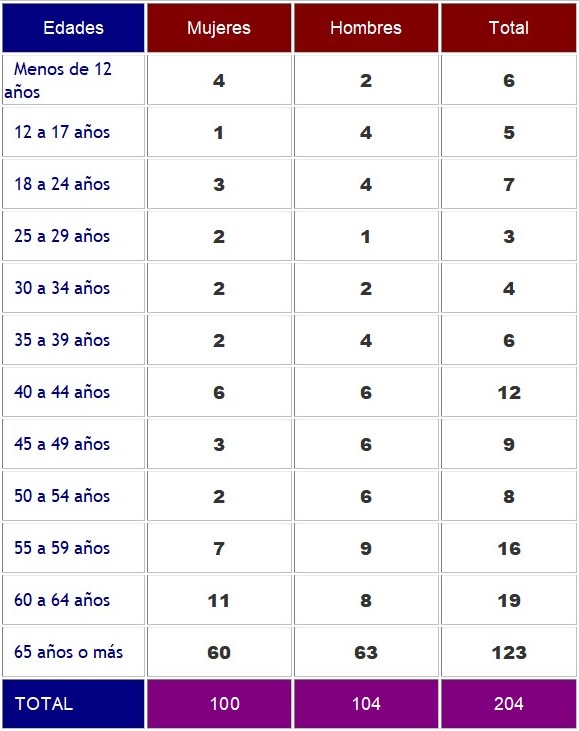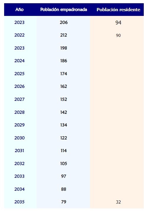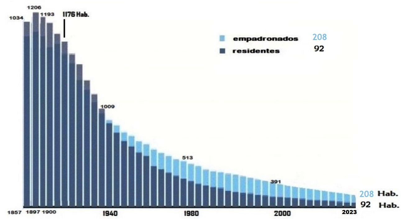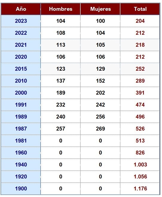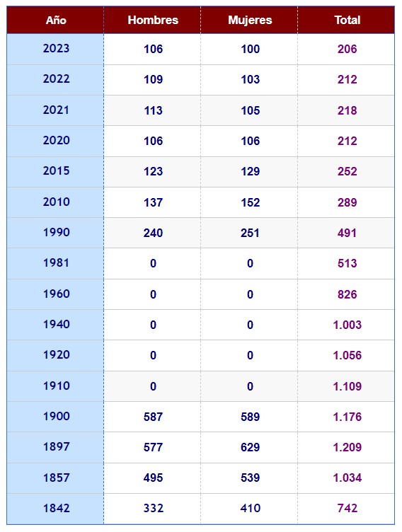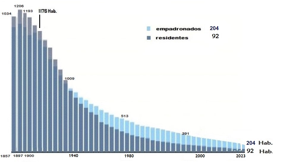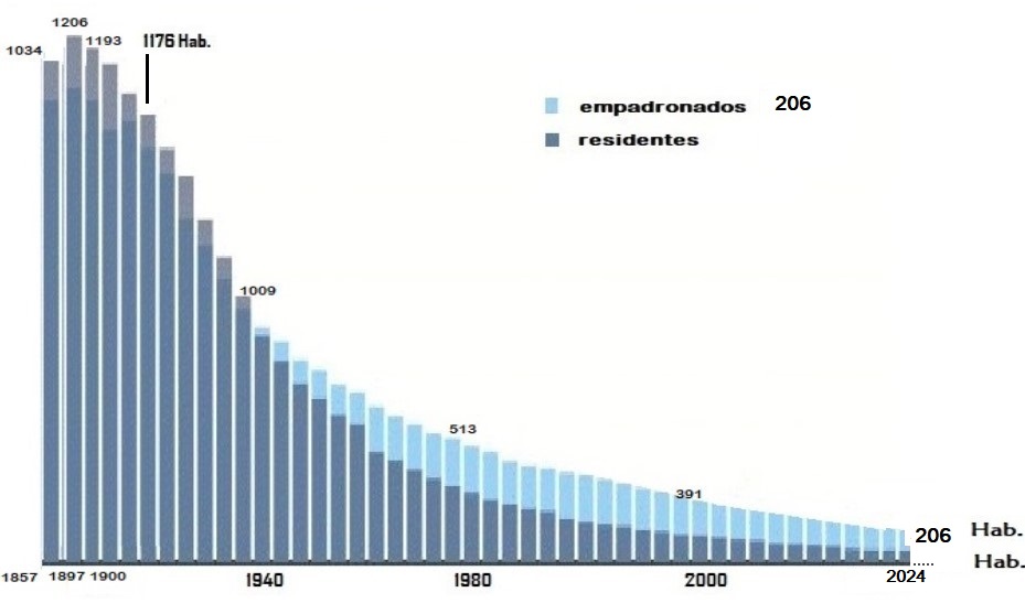 * No obstante al día de hoy los habitantes de derecho (empadronados) está en 206, 106 hombres y 100 mujeres. Los habitantes de hecho (residentes) se situarían en los 92 dependiendo de la época del año.