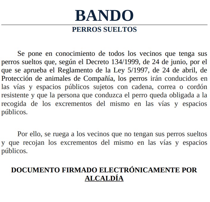Normativa sobre perros El Ayuntamiento de Arrabalde a través de su sede electrónica, publica el Bando sobre normativa de perros, recordando la obligatoriedad de llevar los perros sujetos en vías y espacios públicos, que deben ir sujetos con cadena, correa o cordón resistente, así como a la recogida de excrementos en dichas vías.