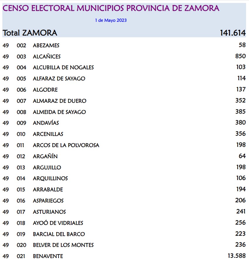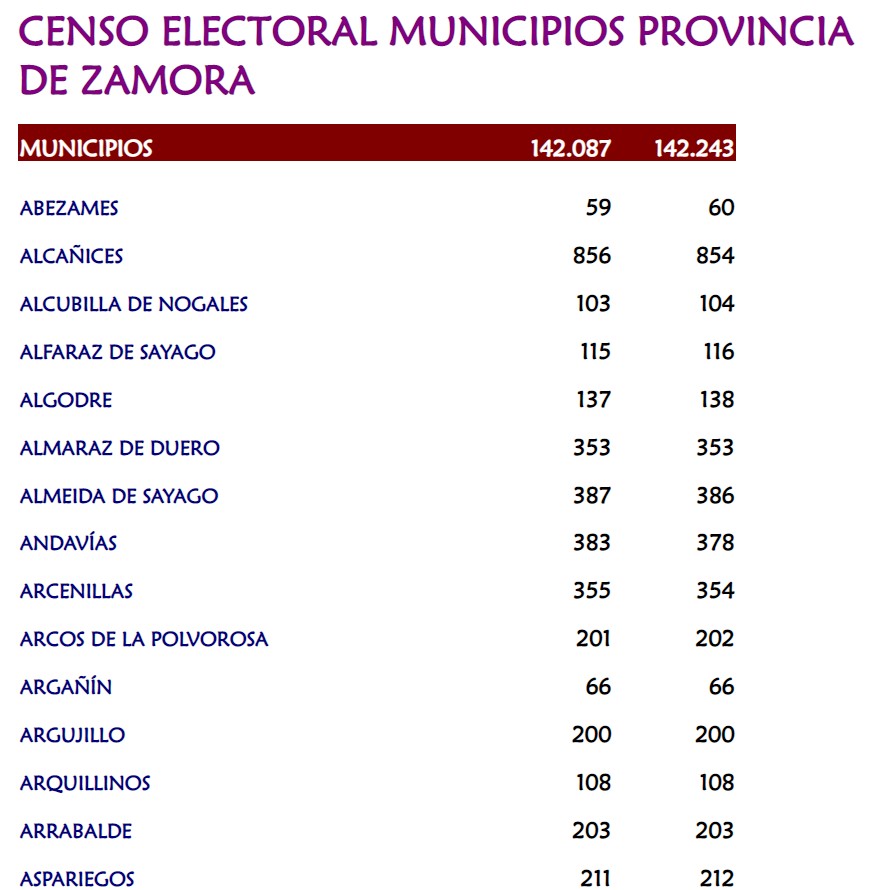 **************************************************** Evolución y actualización del censo electoral en Arrabalde La oficina del censo electoral de la Delegación de Zamora publica el número de electores mayores de edad empadronados en Arrabalde e inscritos en dicho censo al 1 de Septiembre del 2023, consignando el numero de altas y bajas.