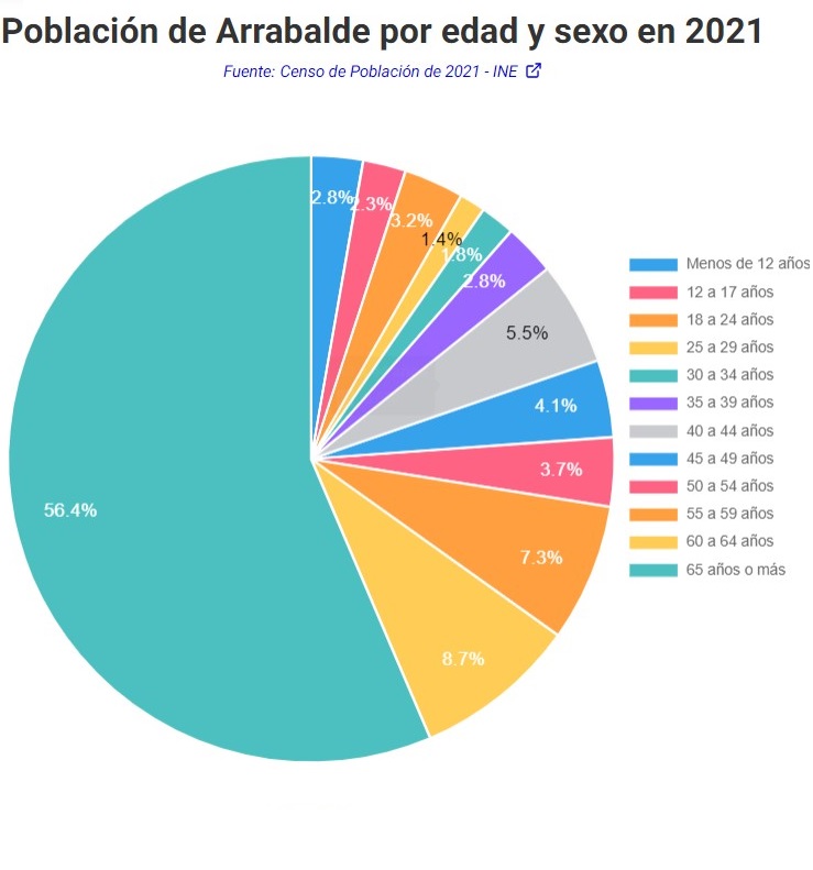 * Según publica el Instituto Nacional de estadística, la población censada electoralmente en Arrabalde se sitúa en 188 personas, 16 menos que en Diciembre del 2022, que alcanzaba la cifra de 204. Pero el número de censados no se corresponde con la población censada residente en el municipio, sino con la población censada empadronada en el mismo a efectos de voto electoral, ya que una cosa es la población de derecho (empadronada) y otra la de hecho (residente), que según la estadística estaría en las 96 personas. En todo caso la población empadronada se situaría en las 199 al día de hoy.