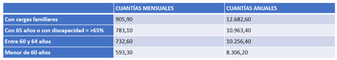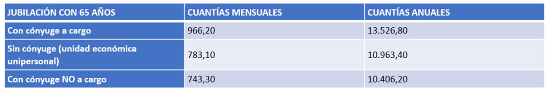 *************************************** Datos de interés Hoy: Pensiones Cuantía mínima de las pensiones de jubilación para 2024 Con cónyuge a cargo: la pensión mínima será de 14.453 euros brutos anuales (1.032 al mes). Sin cónyuge: la pensión mínima para personas de 65 años o más es de 11.503,56 euros anuales (821 al mes)y para menores de 65 años es de 10.761,73 euros anuales (768 al mes). Las pensiones para el 2024 subirán en torno al 4%