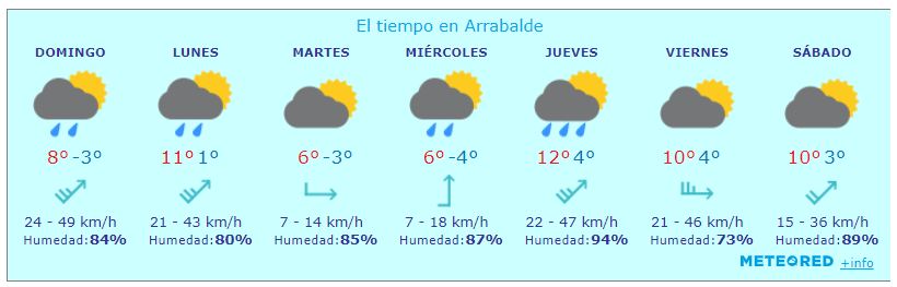 Se acerca un puente (el de la Constitución con la Inmaculada), que mas parece un acueducto, donde millones de personas se desplazarán a sus segundas residencias. Es tiempo de frío y también puede que nieve, así que mucha precaución en carretera y no olvídeles el kit de supervivencia para situaciones de emergencia por temporal crítico de lluvia, frío o nieve. Alerta por lluvias y bajas temperaturas Entramos en la semana mas fría desde que empezó el Otoño y continuara durante los próximos 7 días. Arrabalde rondará los -5 bajo cero y se suavizaran un poco las temperaturas con la llegada de las lluvias, así que a cuidarse y abrigarse. Y en carretera no olvidéis: depósito lleno, cadenas, mantas, alimentos y Kit de supervivencia Temperaturas en Arrabalde para la semana que entra