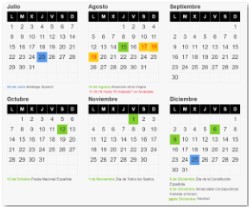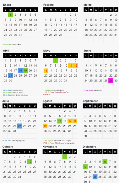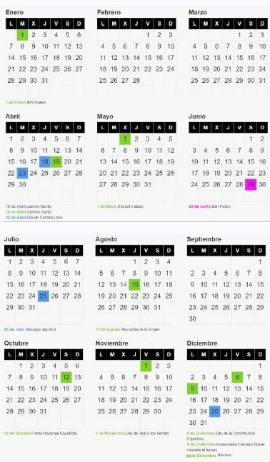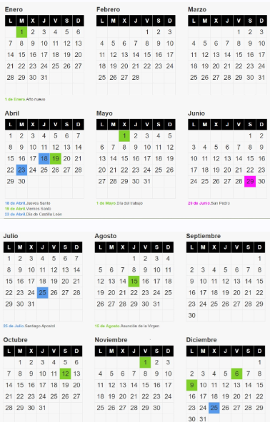 Las fiestas laborales, con carácter retribuido y no recuperable en el ámbito de la Comunidad de CyL, para el próximo año son el 1 de Enero (año Nuevo) y 6 (día de Reyes, que se traslada al 7)), el 18 de Abril (Jueves Santo), el 19 (Viernes Santo) y el 23 (día de CyL), el 1 de Mayo (día del Trabajo), el 15 de Agosto (la Asunción), el 12 de Octubre (día de la Hispanidad), el 1 de Noviembre (día de todos los Santos), el 6 de Diciembre (día de la Constitución), el 8 (Inmaculada Concepción) y el 25 (Navidad)