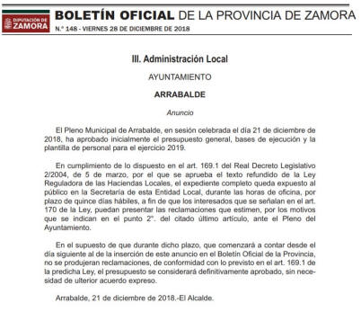 El Ayuntamiento de Arrabalde aprueba el presupuesto general, asi como las bases de ejecución y la plantilla de personal para el ejercicio del 2019, como podeis ver en EL B.O. de la provincia. haz clic en miniatura para leer