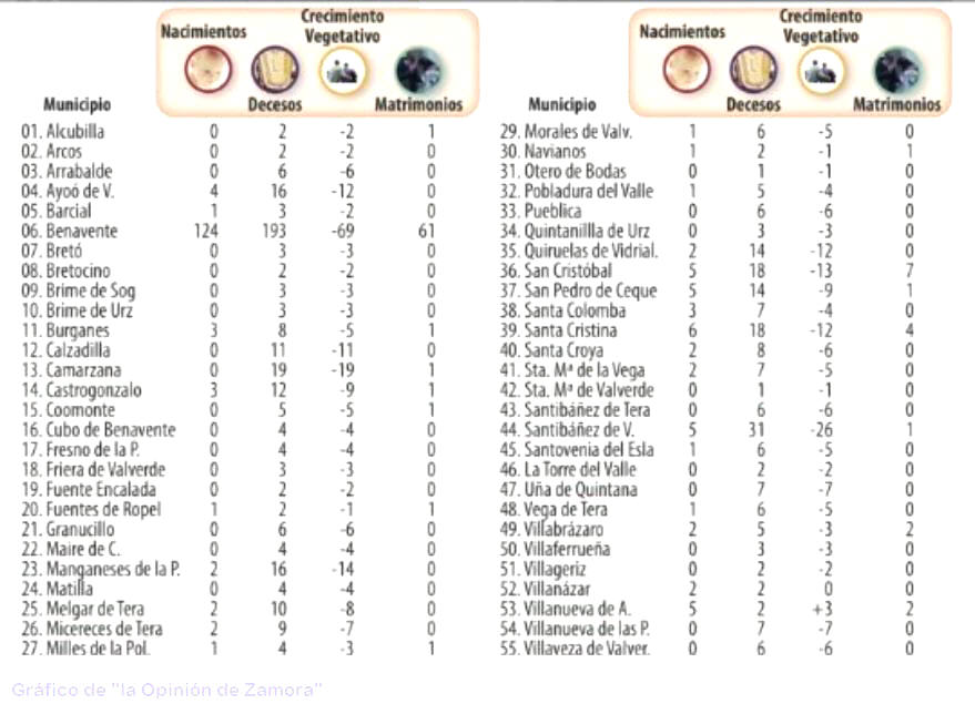 DATOS CURIOSOS La Comarca Benaventana registra tres defunciones por cada nacimiento según "La Opinión de Zamora" y en 23 localidades de las 53 que componen la comarca, no ha nacido un niño en 2 años ni siquiera un solo matrimonio. Como he comentado en otras ocasiones, la realidad demográfica resulta cada año mas lacerante, ya que cada vez se producen mas defunciones y menos nacimientos dado el elevado numero de la población envejecida. Aporto el gráfico del correo "La Opinión" donde podemos observar la deriva demográfica del valle incluido nuestro pueblo.