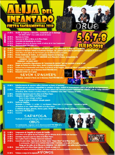 Se inicia el mes de Julio y ya tenemos las primeras Fiestas en los pueblos cercanos. Este fin de semana le toca a Alija del Infantado. Y el siguiente a Aguilar de Tera. Tambien Villajeriz. Así que a disfrutarlas. Los grupos que actúan en las de Alija como podéis ver en el programa de fiestas son: SEVEN CRASHER, SARATOGA, OBUS y KRONOS. Haz clic en la imagen