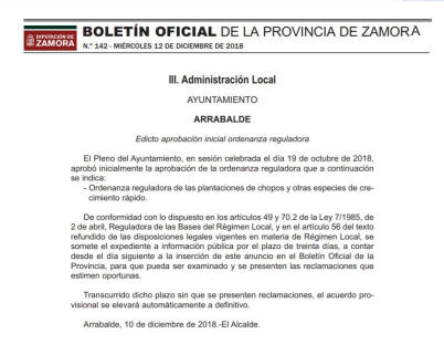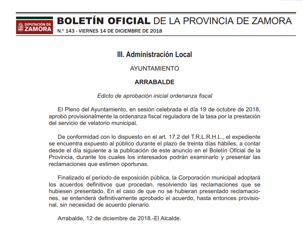 El B.O. de Zamora publica el edicto del Ayuntamiento de Arrabalde