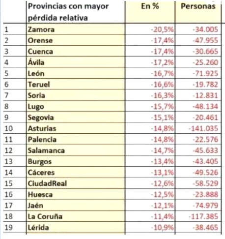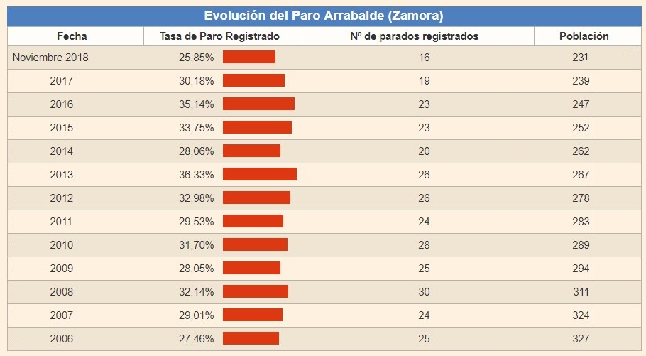 ACTUALIZACIÓN DATOS SOCIOECONÓMICOS DE INTERÉS : - El Salario Mínimo Interprofesional esta en 735.9 euros mensuales. - El déficit acumulado anual en España se sitúa en 36.336 millones.- La deuda contraída por España asciende a 1.144.298 millones.- La Prima de Riesgo esta en 101 puntos. - La tasa de variación anual del IPC en España en mayo de 2018 ha sido del 2%. - El nº de pensionistas en España es de 9.592.963. (5.892.842 son por jubilación; 2.392.586 por viudedad; 949.169 por incapacidad; 342.082, por orfandad, y 40.965, por favor a familiares.) - El coste de las pensiones en España es de 8.992.963 euros. - La población de derecho *(empadronada) actual en España está en 46.549.055 habitantes. - El Paro en España se sitúa en el 15,9% (3.766. 700). - El nº de afiliados a la seguridad social en España es de 18.531.107 - La población empadronada actual en la Provincia de Zamora está en 177.404 habitantes. - El nº de desempleados en la provincia de Zamora está en 14.626. - El nº de afiliados a la seguridad social en Zamora está en 56.204. - La población empadronada actual en Arrabalde está en 233 habitantes. - La población residente se sitúa en torno a los 146 habitantes* - El Paro en Arrabalde al 1 de Julio está en 20 personas. - El nº de afiliados a la seguridad social en Arrabalde está en 17 personas. - La población activa en edad de trabajar (*habitantes entre 18 y 65 años), se sitúa en los 88. - La pérdida de población en Arrabalde se sitúa entre 10 y 12 habitantes de media al año. - La deuda de las arcas municipales del Ayuntamiento de Arrabalde es de "0" euros * La población de hecho (residente) varía considerablemente