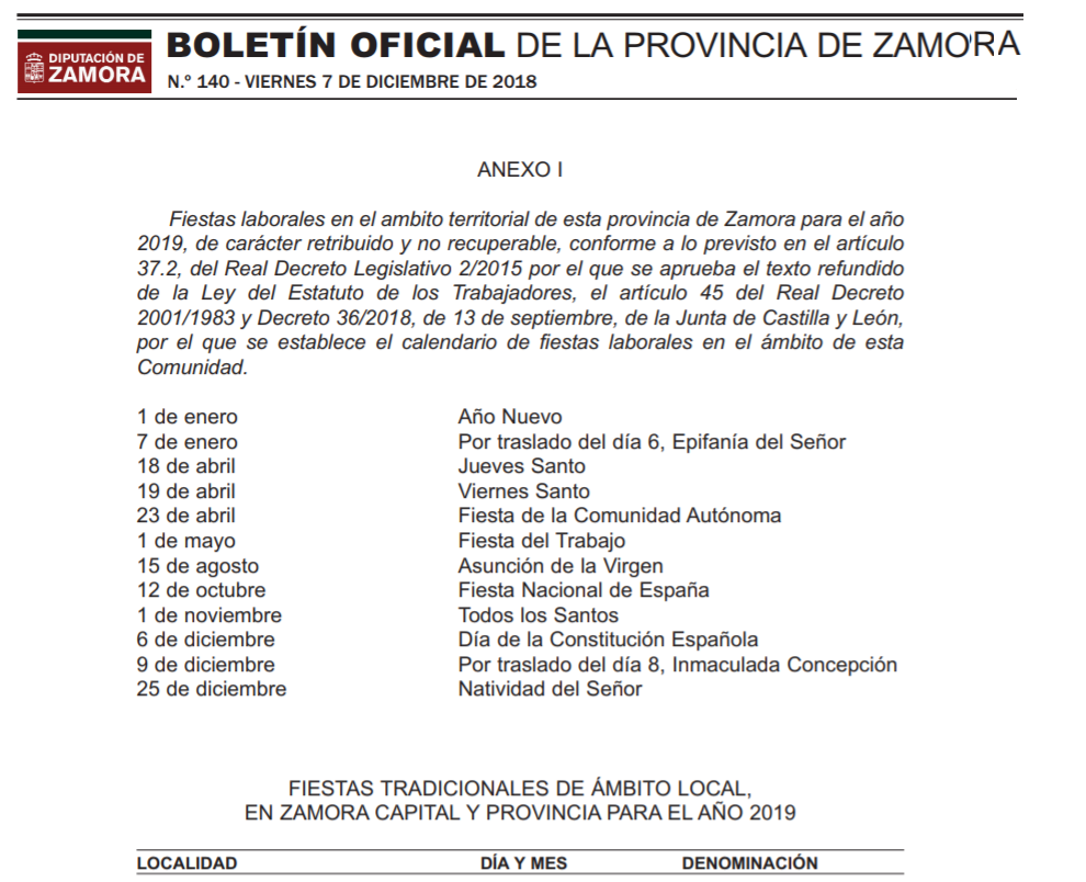 El B.O. de Zamora ha publicado el calendario de fiestas laborales y locales de todos los pueblos de la provincia para el año 2019. También puedes ver en pdf todas las fiestas de los pueblos de Zamora.