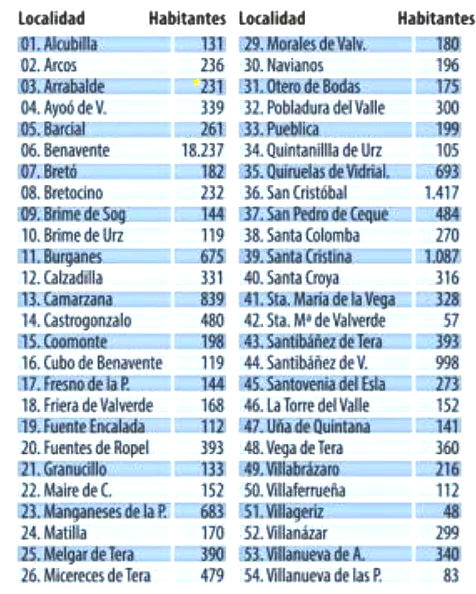 LA DESPOBLACIÓN CONTINUA INEXORABLE La comarca Benaventana pierde mas de 500 habitantes al año. Según el INE la población empadronada en los 56 municipios que integran el partido judicial de Benavente lleva descendiendo desde el año 1998, unos datos que confirman el drama poblacional que esta sufriendo la provincia y especialmente la comarca benaventana, algo de lo que no se libra nuestro querido pueblo que de 1.276 habitantes que tuvo en su día, se ha quedado en 231. Graficos: Población en los pueblos de la comarca de Benavente, y evolución de la población en la comarca benaventana