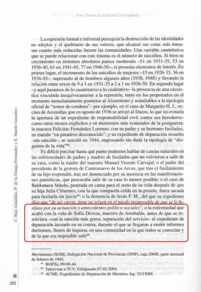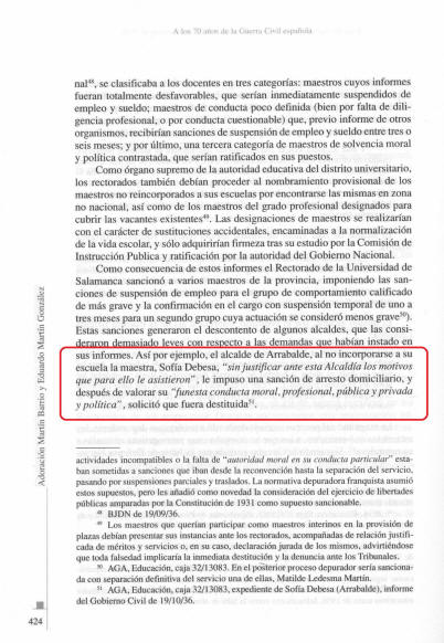 UN BREVE APÉNDICE EN LA HISTORIA DE ARRABALDE Como dato curioso tuve ocasión de revisar ciertos archivos (en la propia Biblioteca Nacional), de Memoria histórica en el volumen de "A los 70 años de la Guerra Civil española" los expedientes de depuración de maestros, encontrándome con una referencia, correspondiente a la represión contra el Magisterio Zamorano después de la guerra, donde se cita a Dña. Sofía Debesa, maestra de Arrabalde, que dice lo siguiente: Doña Sofia Debesa era la maestra de Arrabalde durante el periodo 34-36 y tenía a su cargo 81 niñas. Dña Sofía inicio el curso escolar 1935/1936 y lo fue concluyendo sin ninguna novedad, pero en el último ejercicio del 36 estallo la Guerra Civil y el día 27 de Agosto del 36, fue depurada por el nuevo gobierno que a tenor de los informes la consideró incompatible para la enseñanza por sus ideas de izquierdas y ser fiel a los principios de enseñanza de la república, por lo que se le abrio expediente y fue cesada definitivamente en su cargo. A consecuencia de tal hecho, enfermo gravemente falleciendo al poco tiempo. Se dió la paradoja, mas bien incongruencia, que el comité sancionador (Tribunal Regional de Responsabilidades Políticas) le impuso una sanción de 15.000 pesetas después de muerta. *En Castilla y león fueron depuradas por se adictas a la República 49 maestras y 133 maestros. 2 referencias del hecho, en el libro " A los 70 años de la Guerra Civil española" Si alguien quiere consultar algún dato puede hacerlo en estas referencias documentadas