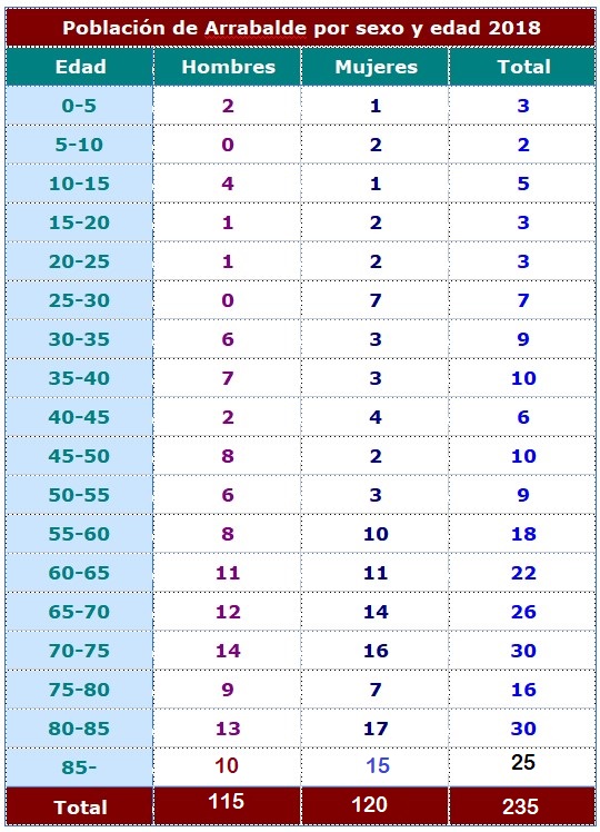 Actualizo los datos de población, según acaba de publicar el INE, dando el número total de habitantes empadronados(habitantes de derecho), que al día de hoy son 231, de los cuales 118 son mujeres y 113 hombres. Los habitantes de hecho (residentes) estaría sobre los 136. Así mismo os dejo la evolución demográfica que ha sufrido el pueblo desde 1900 al día de hoy. Evolución de la población desde 1857 al día de hoy en Arrabalde y pirámide población por edad y sexo. Septiembre de 2018 Mayo 2018