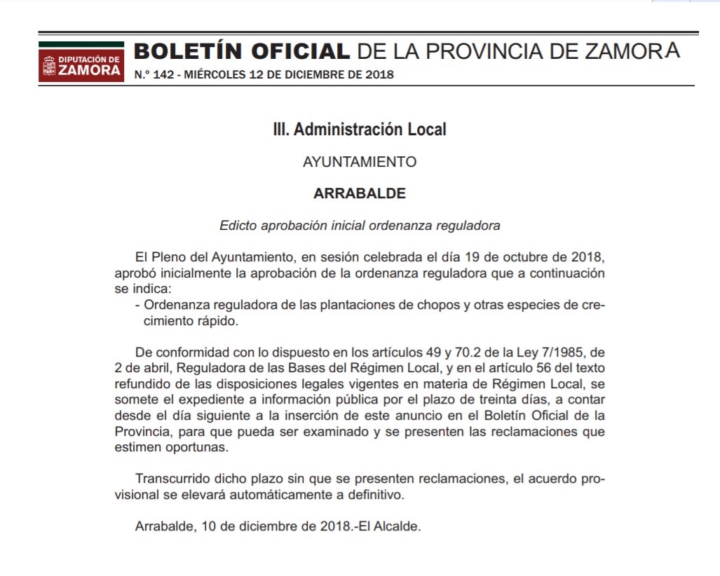 Diciembre Edicto del Ayuntamiento El pleno del Ayuntamiento aprobó la Ordenanza reguladora de las plantaciones de chopos y otras especies de crecimiento rápido según podéis ver a continuación: