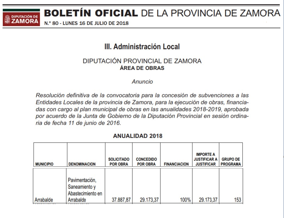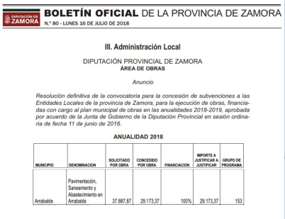 La Diputación de Zamora aprueba las subvenciones a las entidades locales de la provincia, para la ejecución de obras, correspondiendo a Arrabalde la cantidad de 29.173 euros, según podéis ver en la resolución. Puedes ver las concedidas a todas las entidades locales de la provincia en el siguiente enlace:
