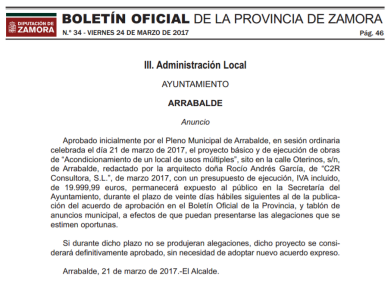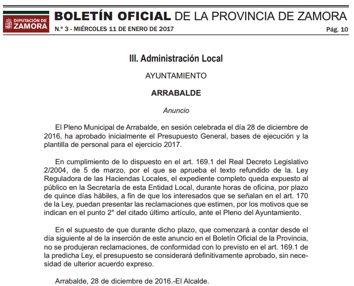 El Pleno Municipal de Arrabalde, en sesión celebrada el día 10 de noviembre de 2017, ha aprobado inicialmente el presupuesto general, bases de ejecución y la plantilla de personal para el ejercicio 2018. Clic en la imagen