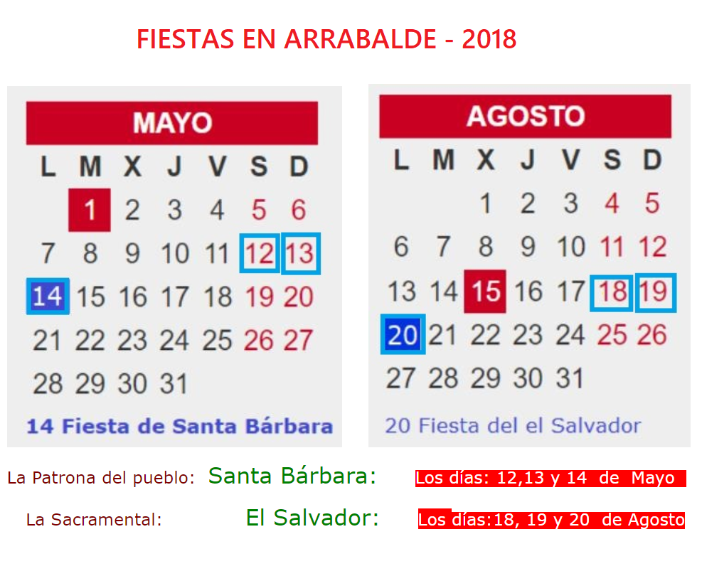 Quedan establecidas las fiestas de Arrabalde correspondientes al Año 2018, según podéis ver en gráfico y espacio de festividades de Arrabalde