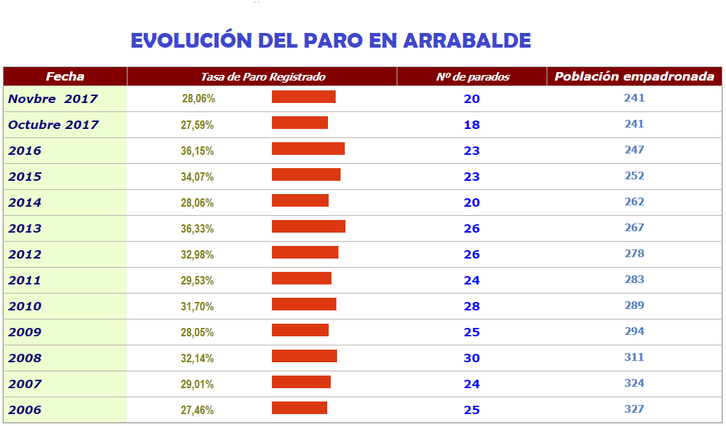 DATOS: - Población desempleada en Arrabalde al 1 de Noviembre, quedando según registran los datos de la siguiente manera: Total nº parados: 18, (de los cuales, hombres son 9, y mujeres 9), correspondiendo a los siguientes sectores: AGRICULTURA ........................ 0
