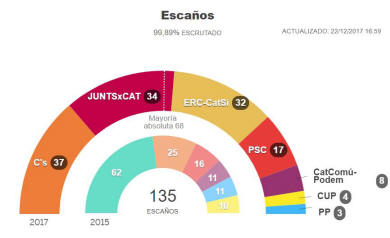 Resultados elecciones Catalanas. Ciudadanos da el gran salto, aunque no podrá formar gobierno. Posiblemente lo haga el bloque independentista, pero ahora con la tranquilidad de que no volverán a intentar una nueva DUI, pues ya saben las consecuencias. Esperemos que el nuevo gobierno catalán se preocupe de las necesidades de los ciudadanos y no de su delirio indepenestista y sus ansias de protagonismo e interés personal.