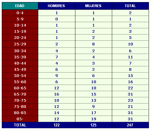 _ Los mayores de 60 años son..................151 (78 mujeres y 73 hombres) _ Entre 30 y 60 años ............................... 65 (31 mujeres y 34 hombres) _ Menores de 30 años .............................. 25 (15 mujeres y 10 hombres)