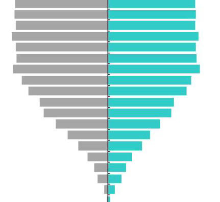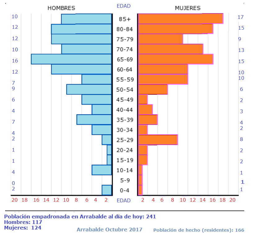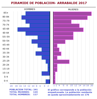 Hoy te muestro el Gráfico orientativo donde puedes ver la pirámide de población en Arrabalde con el numero de hombres y mujeres en cada tramo de edad, en los que se evidencia el envejecimiento de la población, donde los mayores de 60 años superan los 176 habitantes en contraste con el resto de los tramos que no llegan a los 70.