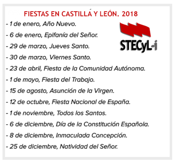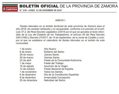 Las fiestas laborales con carácter retribuido y no recuperable en el ámbito de la Comunidad de Castilla y León para el año 2018 serán las siguientes: