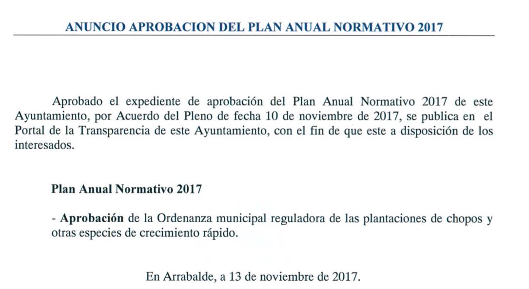 El Ayuntamiento de Arrabalde publica en su Portal de la Transparencia, el plan anual normativo 2017, relativo a la Ordenanza municipal que regula las plantaciones de chopos y otras especies de crecimiento rápido.