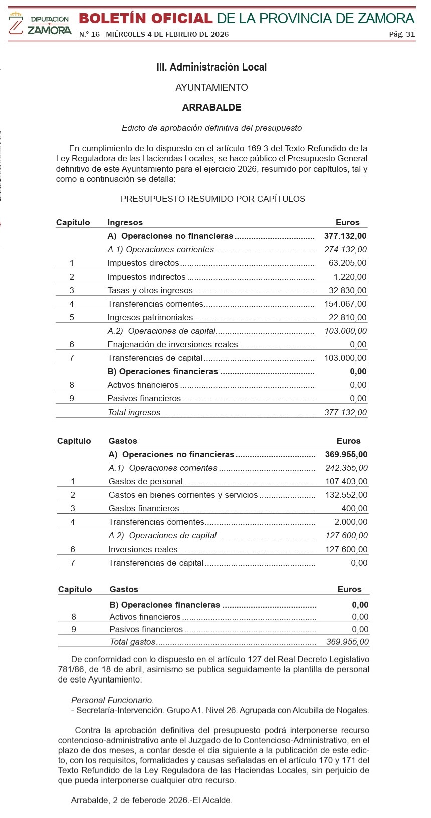 PRESUPUESTOS GENERALES AÑO 2026 Del Ayuntamiento de Arrabalde comparativa